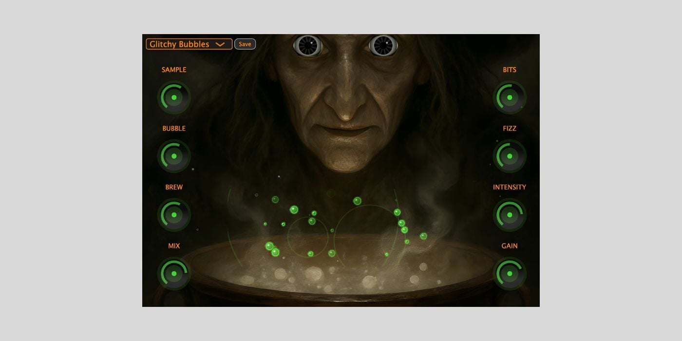 The science behind this witchcraft is that Witch’s Brew Bitcrusher utilizes dual sine waves with a 1.7x harmonic relationship to generate bubble patterns that continuously modulate the sample rate and bit depth.