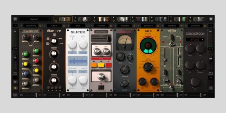 We can choose any of the available 70+ modules to add to an eight-slot rack, creating custom FX/processor chains and channel strips.
