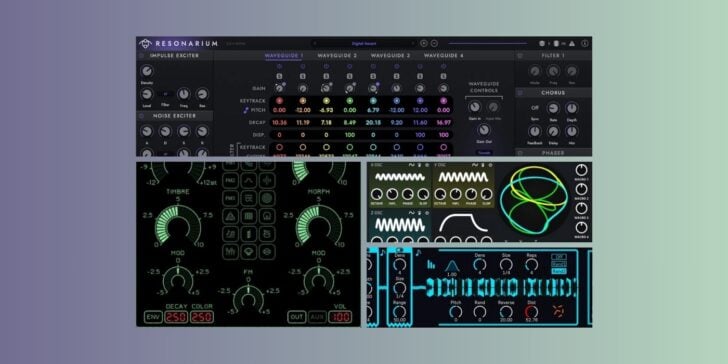 The plugin combines waveguide synthesis, modal synthesis, and Karplus-Strong techniques into a semi-modular environment for abstract sound design.