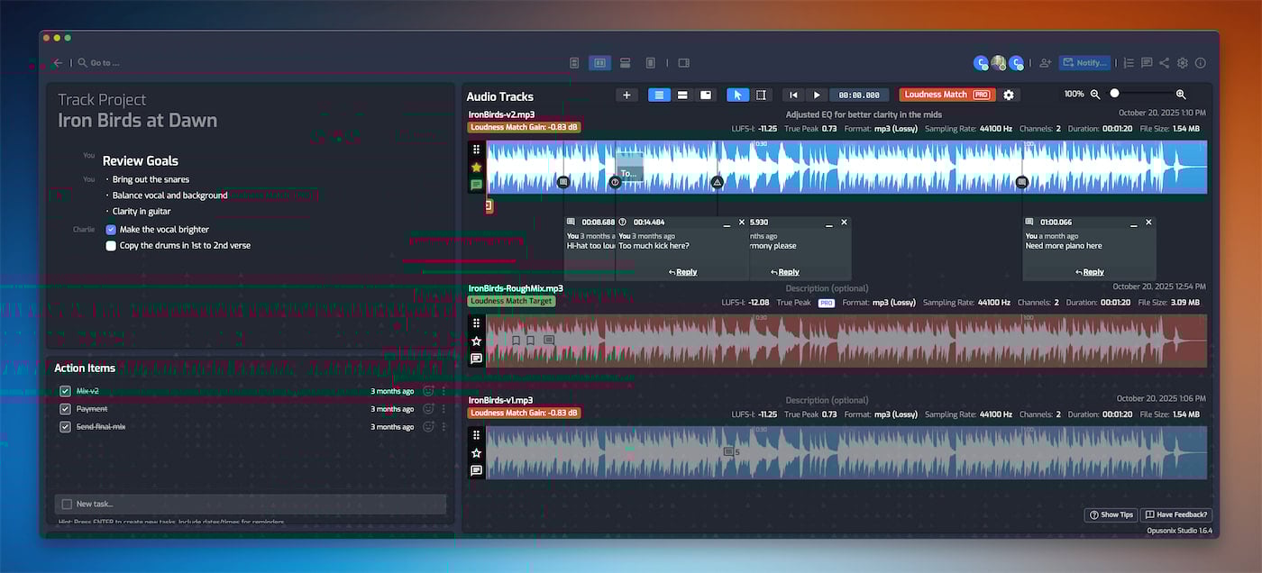 Opusonix also helps keep clients happy. The centralized workspace ensures that notes, tasks, files, mixes, and comments are neatly organized together. Built-in file storage reduces reliance on third-party services, while clear revision management and loudness-matched A/B testing help everyone make better decisions.