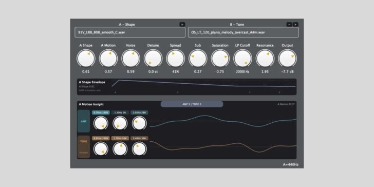 It uses two audio files, A (Shape) and B (Tone), to create a new synthesizer voice. Sound A provides the movement, articulation, and rhythm, while Sound B delivers the harmonic and timbral information, which are then fused together.