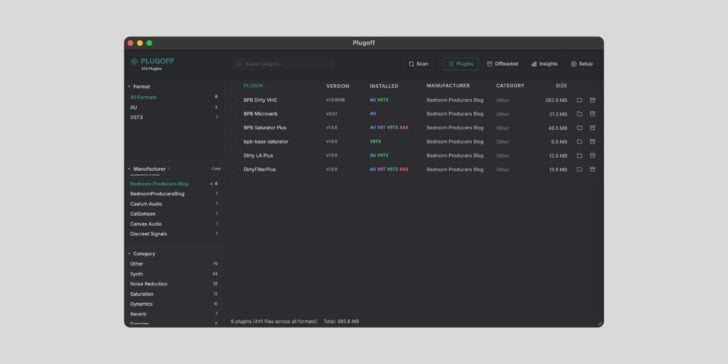 The coolest feature here, though, is offloading. If you want to keep a plugin installed on your system but remove it from your DAW (so it doesn’t show up in your plugin list and doesn’t slow down scanning), Plugoff moves it to a vault folder.